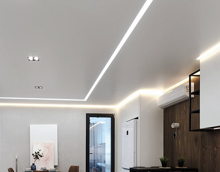 Тем, кто выбирает функциональные решения, мы рекомендуем встроенные LED-лампы, светодиодные ленты, точечные светильники. Они просты в эксплуатации, быстро монтируются, сфера их применения очень широка. Системы освещения имеют ряд свойств: они должны быть надежными, долговечными, декоративными и, конечно, хорошо подсвечивать помещение. Например, парящие натяжные потолки хорошо зарекомендовали себя в спальне, коридоре, гостиной. Они подходят как для ПВХ, так и для ткани, а установить их ненамного дольше обычных натяжных покрытий.