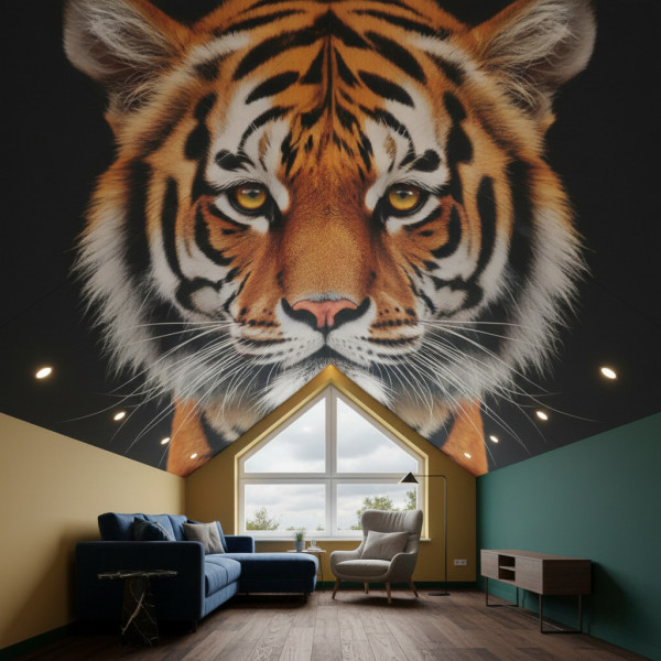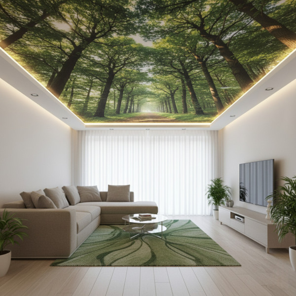 - Прочность — 3Д-потолок сохранит интерьер в случае залива сверху не хуже любой другой натяжной конструкции из пленки ПВХ;