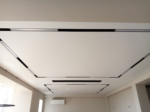 Демпферная система крепления позволяет быстро установить полотна с идеальными стыками, встраивать в них любой вид освещения: треки разного размера, точечные светильники.