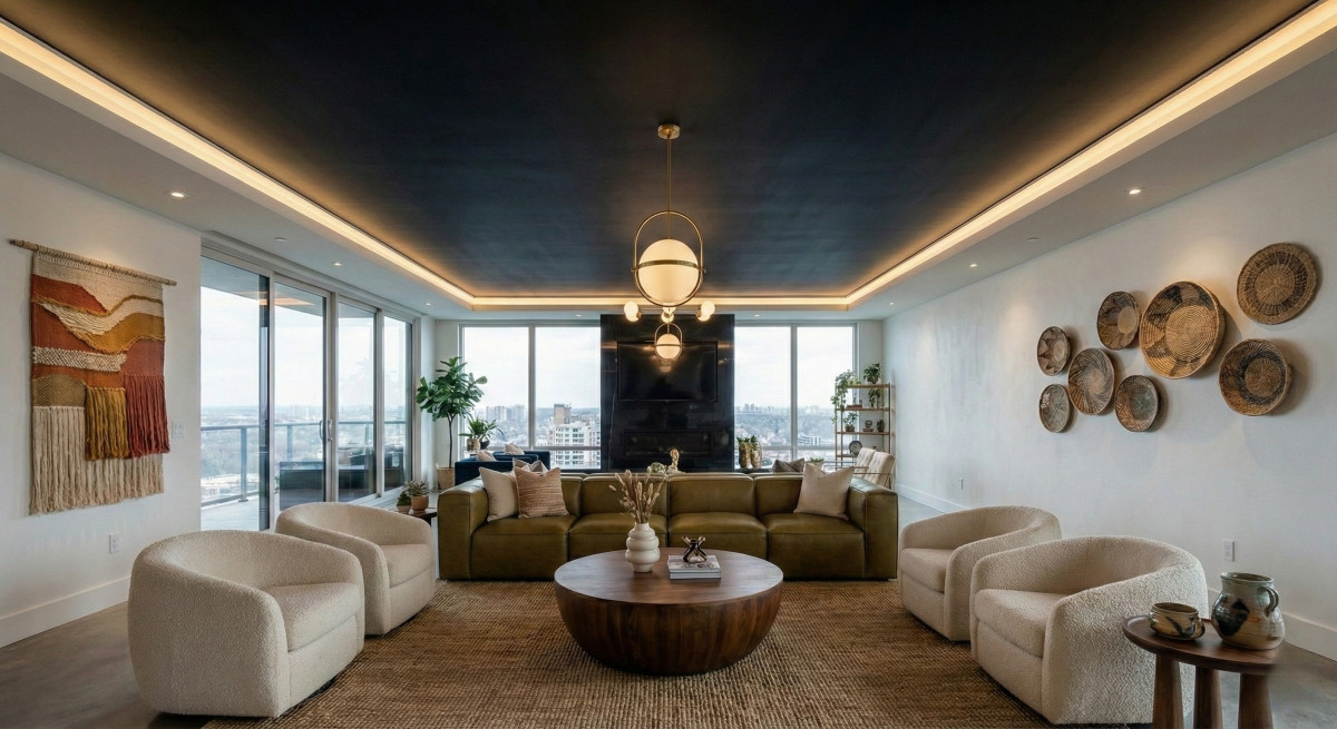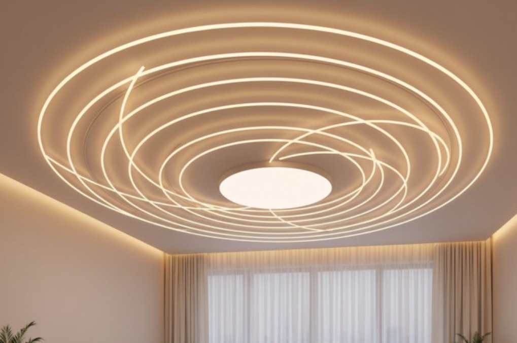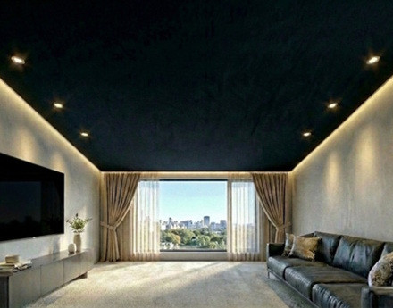 В зале хорошо смотрятся зрелищные потолки, такие как трехмерные, которые имеют рисунок или перфорацию. Они делают помещение больше, объемнее, при этом подсвечивая его.