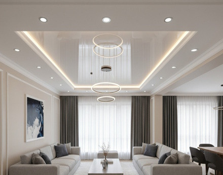 Мы рекомендуем посмотреть самые визуально интересные примеры работ нашего производства на нашем сайте. Вне зависимости от количества комнат в квартире, зал — центральное помещение, аккумулирующее всеобщее внимание. Центр притяжения должен быть максимально гармоничным, поэтому атмосфера уюта так важна. Сделать это проще всего, быстро установив потолок из ПВХ или ткани. С выбором дизайна и производителя поможет наш специалист на выезде в город на замер. На месте ответит на все вопросы, рассчитает стоимость заявки, срок исполнения с учетом обхода труб и углов.