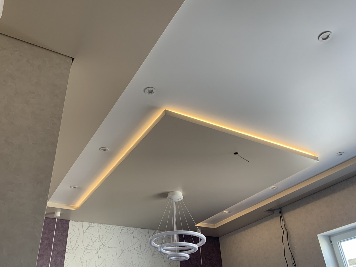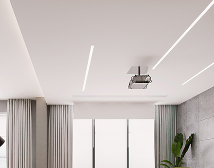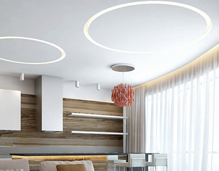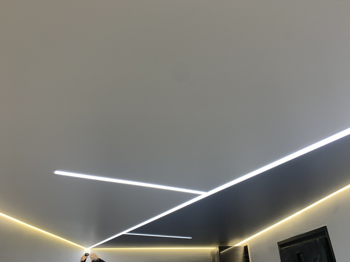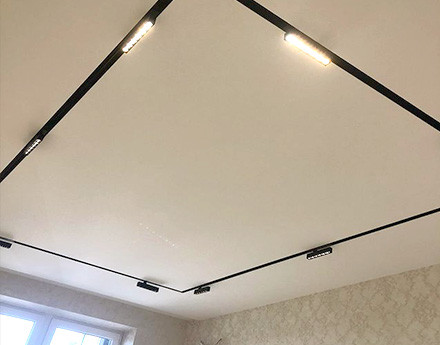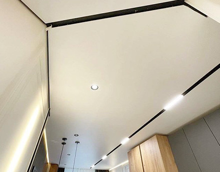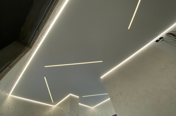 Тем, кто выбирает функциональные решения, мы рекомендуем встроенные LED-лампы, светодиодные ленты, точечные светильники. Они просты в эксплуатации, быстро монтируются, сфера их применения очень широка. Системы освещения имеют ряд свойств: они должны быть надежными, долговечными, декоративными и, конечно, хорошо подсвечивать помещение. Например, парящие натяжные потолки хорошо зарекомендовали себя в спальне, коридоре, гостиной. Они подходят как для ПВХ, так и для ткани, а установить их ненамного дольше обычных натяжных покрытий.