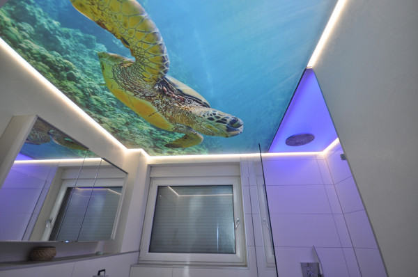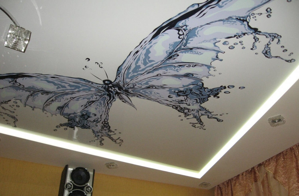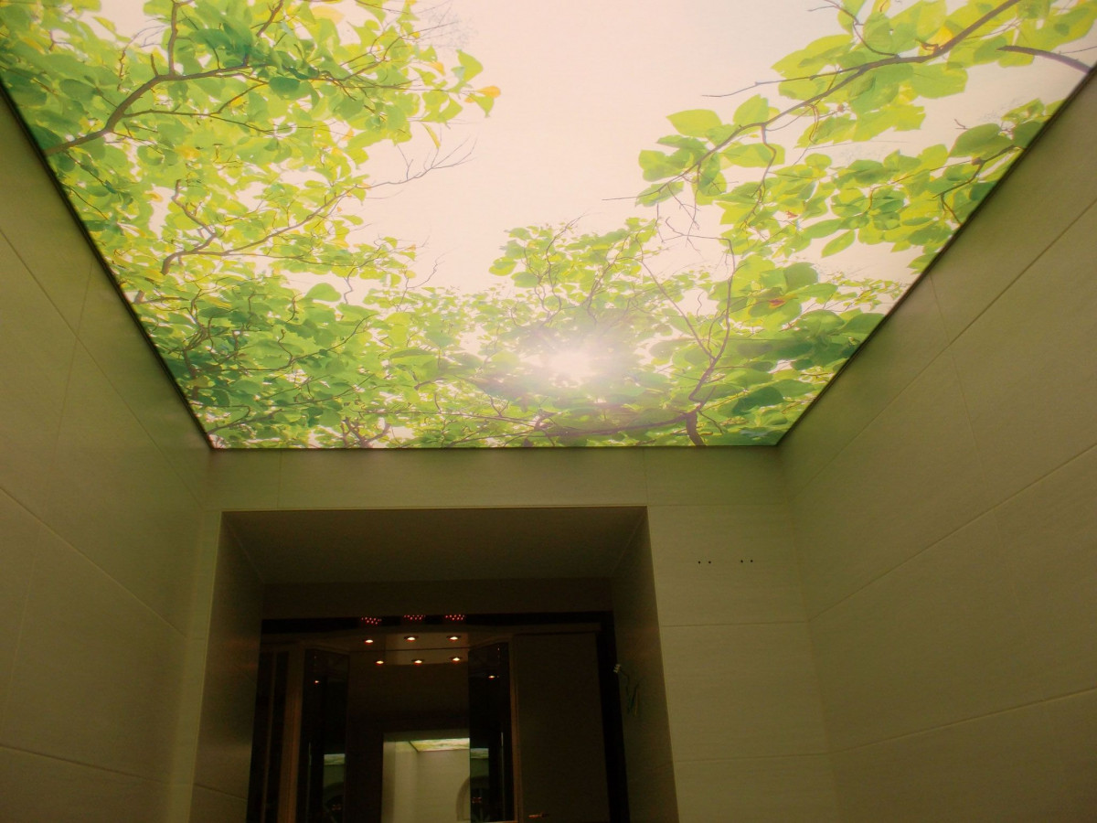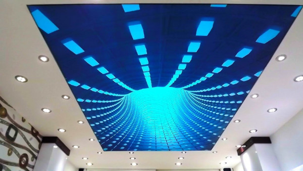 - Прочность — 3Д-потолок сохранит интерьер в случае залива сверху не хуже любой другой натяжной конструкции из пленки ПВХ;