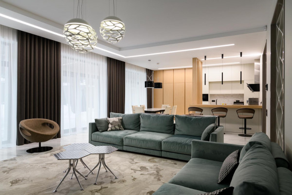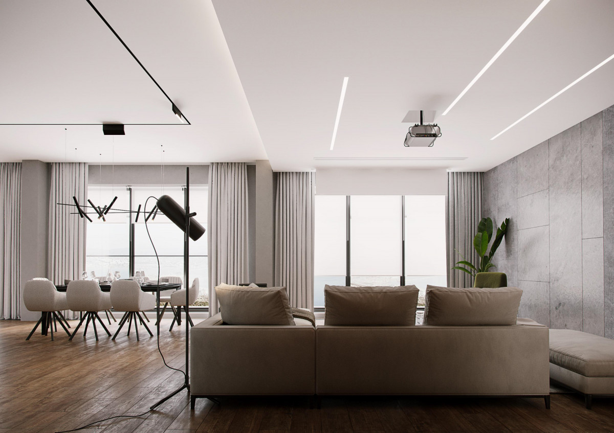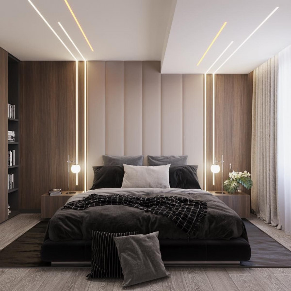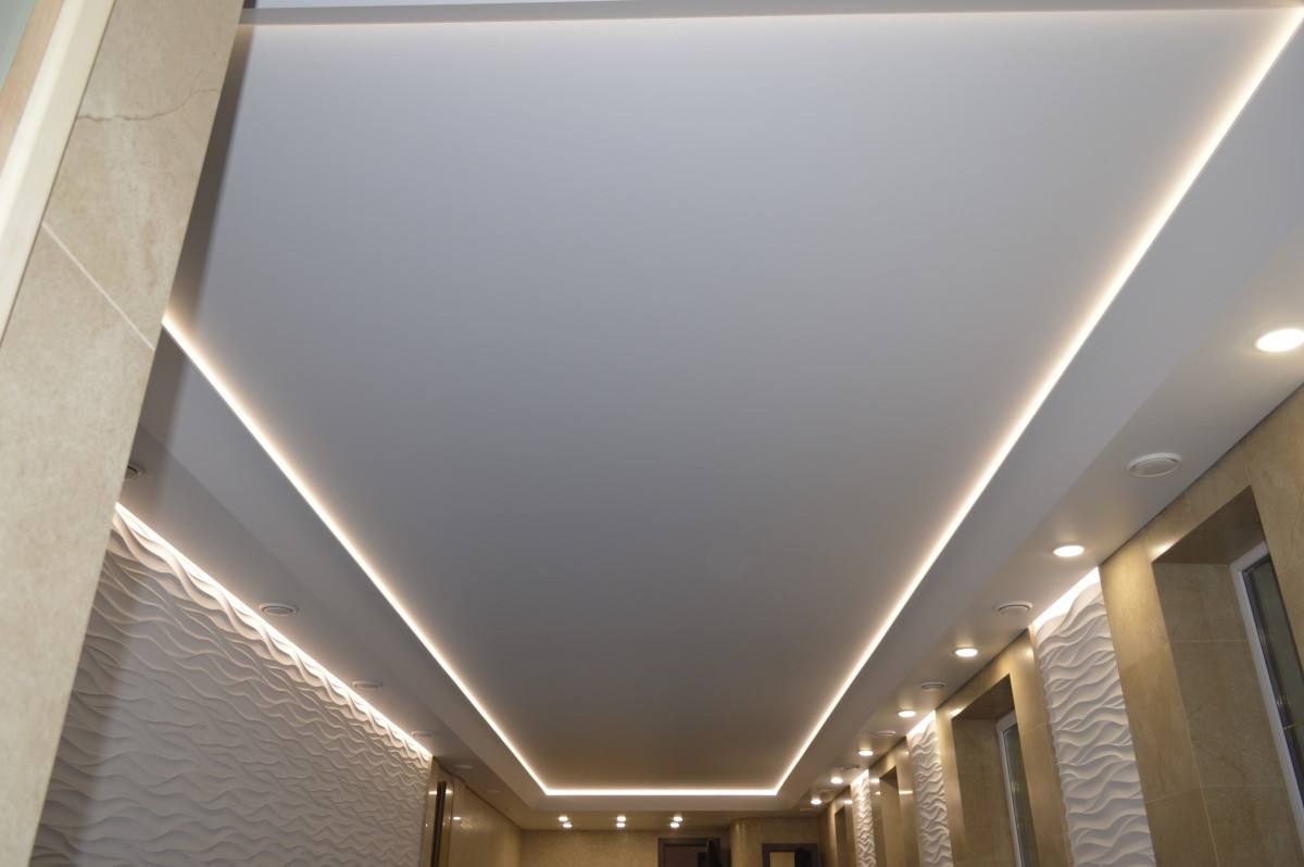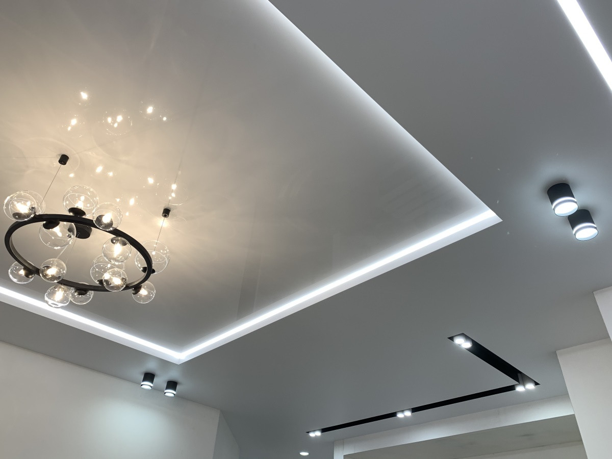 Нужно подсветить зону с помощью спотов над диваном или рабочем столом в кабинете? Заложим в проект натяжного потолка уровень со встроенным освещением.