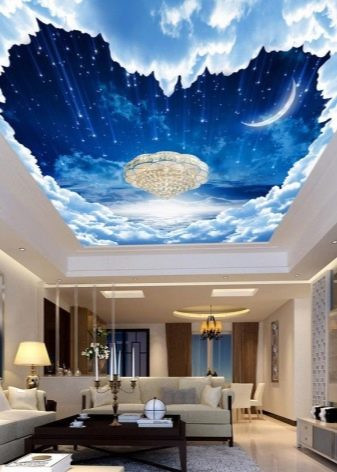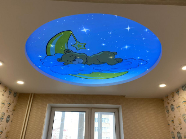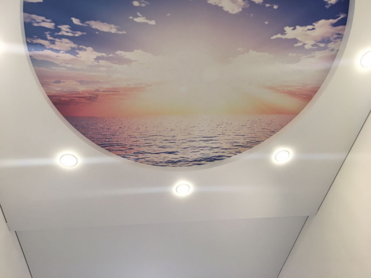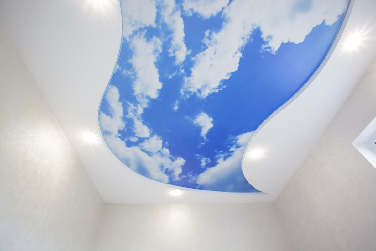 Смотрите фото готовых работ в Казани — есть одноуровневые конструкции, в которых небо занимает всю площадь, а есть потолки в два и более ярусов, где рисунок делает акцент на какой-либо части интерьера.