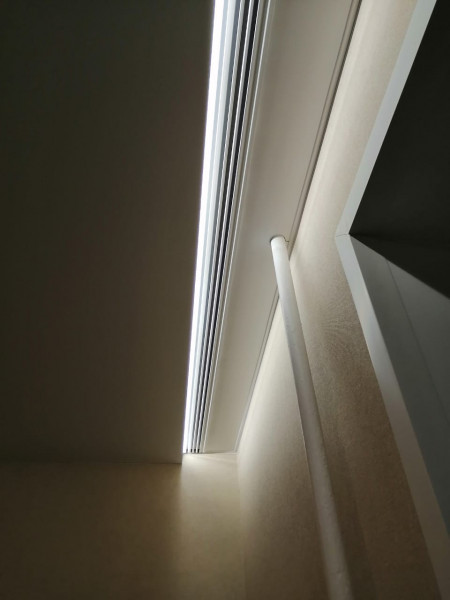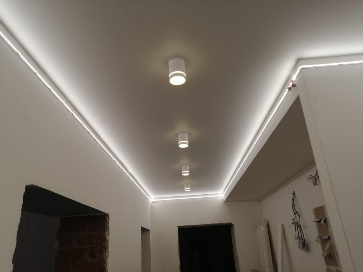 светодиодная лентаХороша для создания скрытой подсветки. Это может быть полоска света между стеной и потолком, как в парящих потолках по периметру или карнизах. Также они создают линии заданной геометрической формы на потолочной поверхности. Поверх профиль с диодной лентой в ПВХ или ткани закрывается полупрозрачной заглушкой, которая рассеивает свет, просто «стирая» отдельные лампочки.