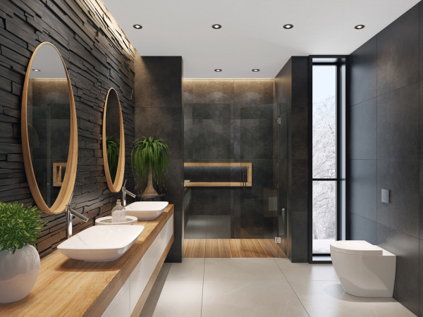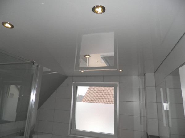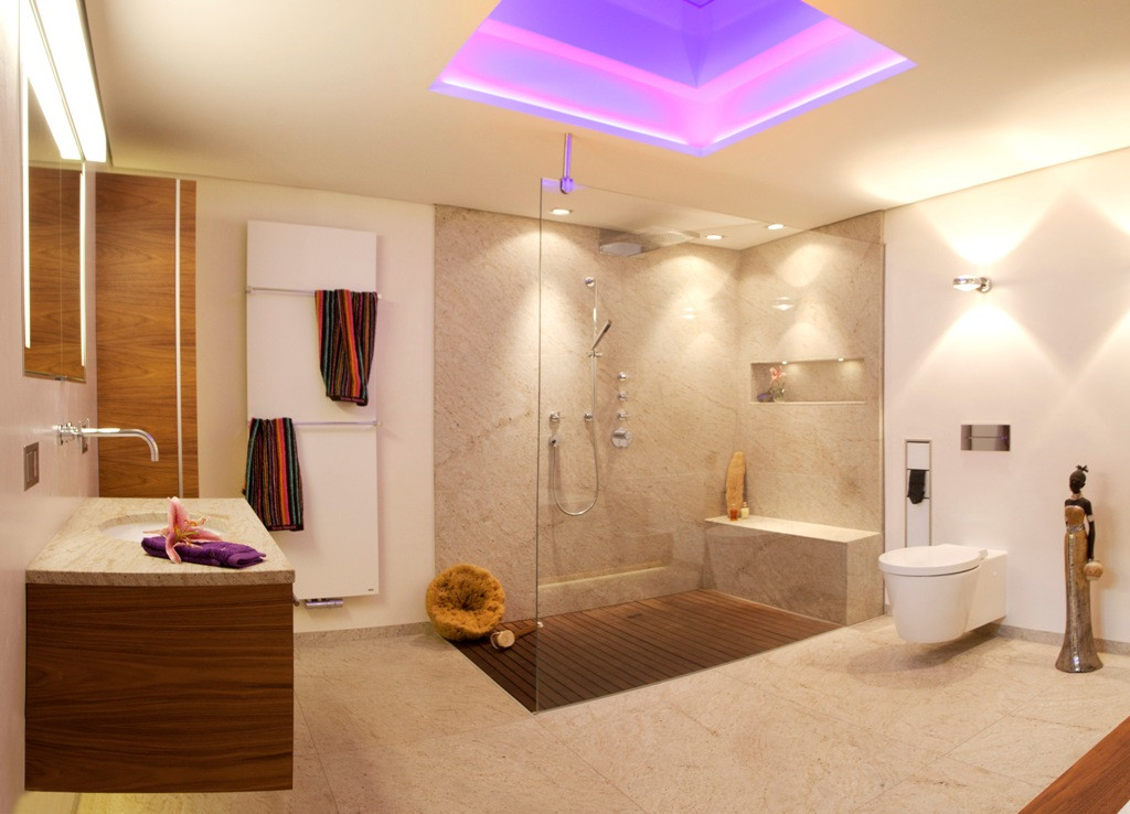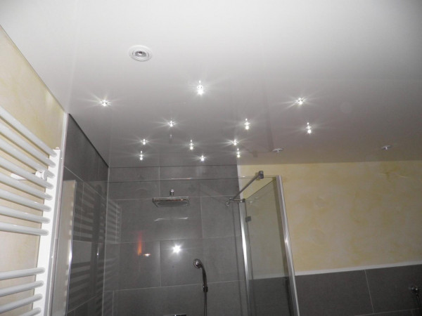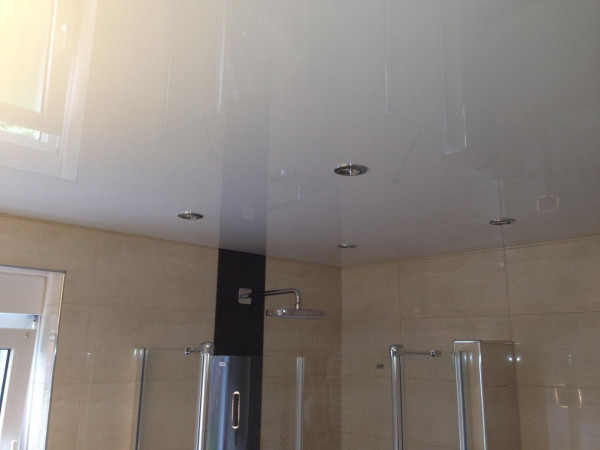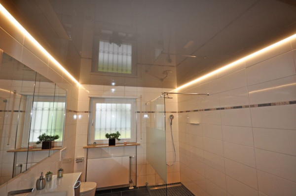 Очень важен для ванной свет. Воспользуйтесь возможностями натяжного потолка сделать встроенное освещение: нишевая засветка, светодиодная лента по периметру, точечные светильники и т. п.