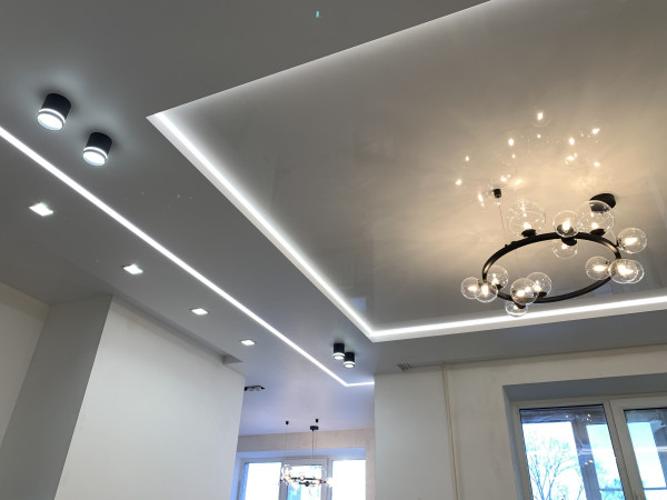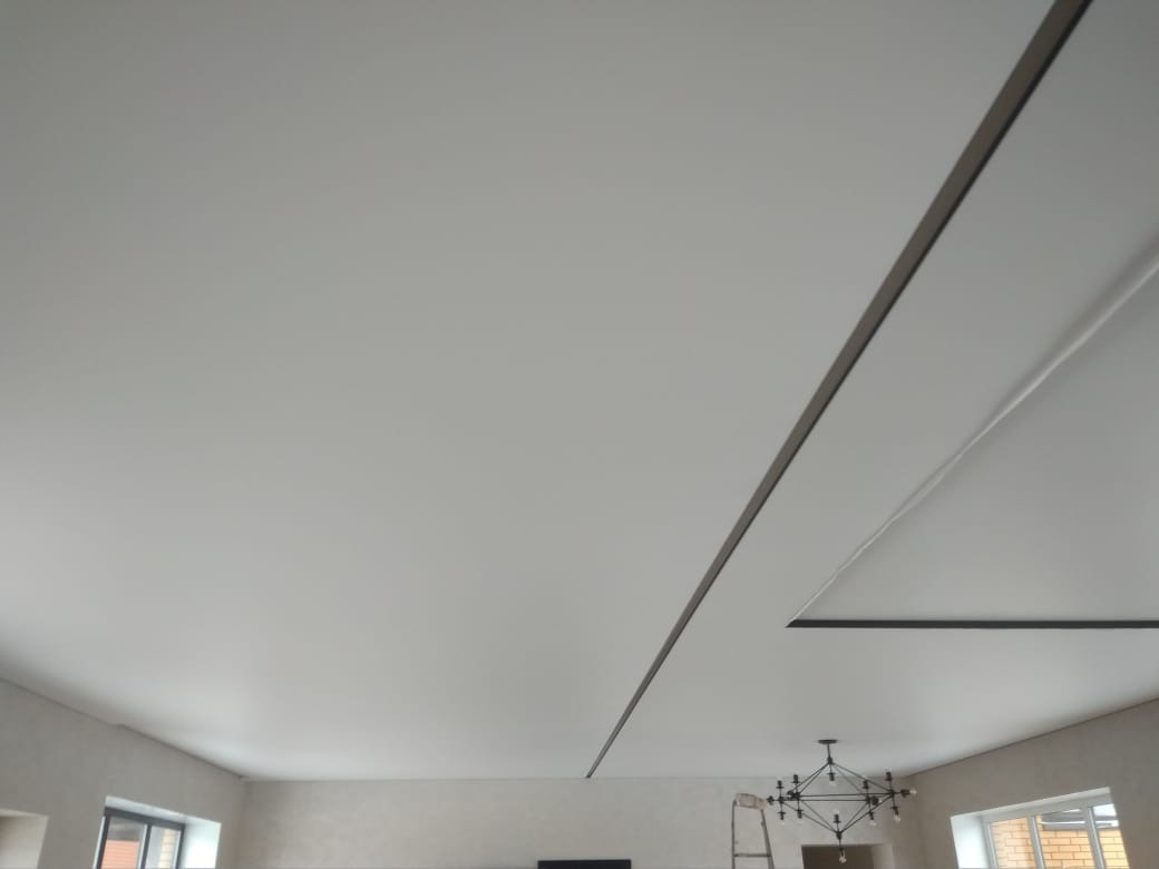 Сатиновые натяжные потолки — неброские, аккуратные, изысканные. В общественном пространстве или в спальне они будут уместны.